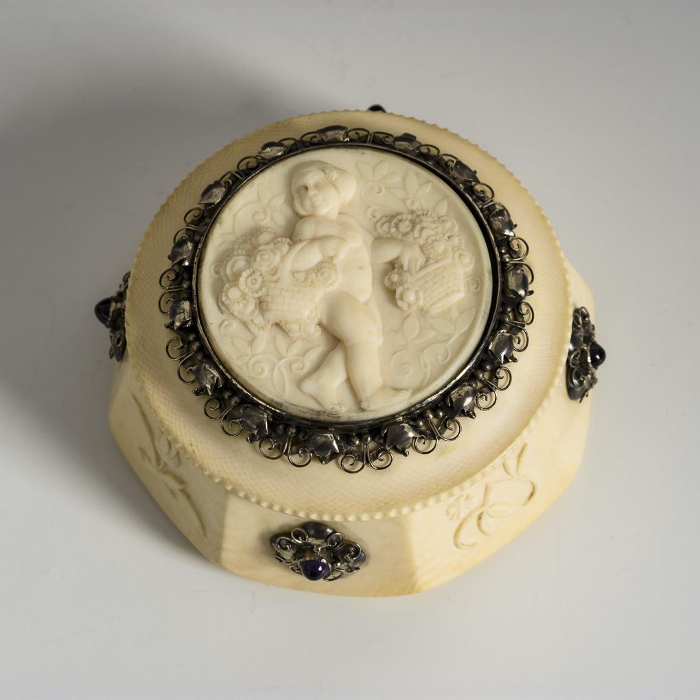 Oktogonale Dose. Alternierend geschnitzte Blumen und applizierte Silberrosetten mit Amethyst-Cabochons auf den schrägen Wandsegmenten. Passdeckel mit Puttorelief in montiertem Silberkranz; im Deckel kleine Perlmutt-Einlage.