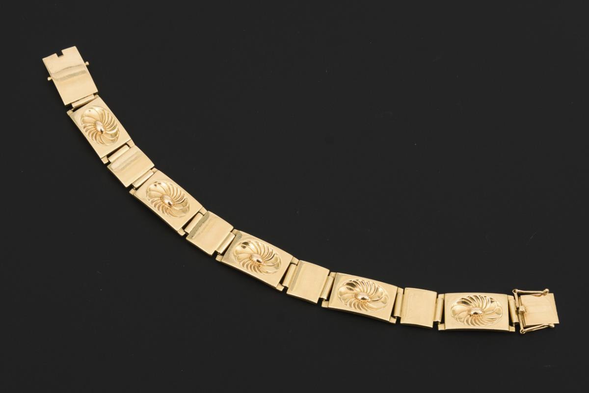 Massives Gliederband mit Blütenreliefs, an Kastenschloss mit 2 Achtersicherungen.