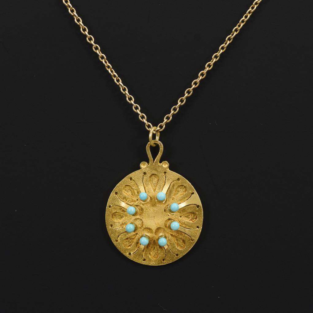 Ornamentverzierter Anhänger mit türkisfarbenen, kleinen Kugeln. Ankerkette mit Ringfederschließe.