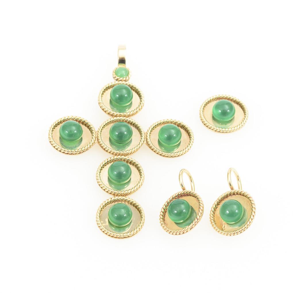 Großes Kreuz, Ohrhängerpaar und "Ersatzknopf" mit Kordelrändern und aufgebrachten Grünachat-Cabochons. Starre Öse, Einhängehaken. Ovales Elfenbeinetui mit geschnittenem Monogramm "ER".