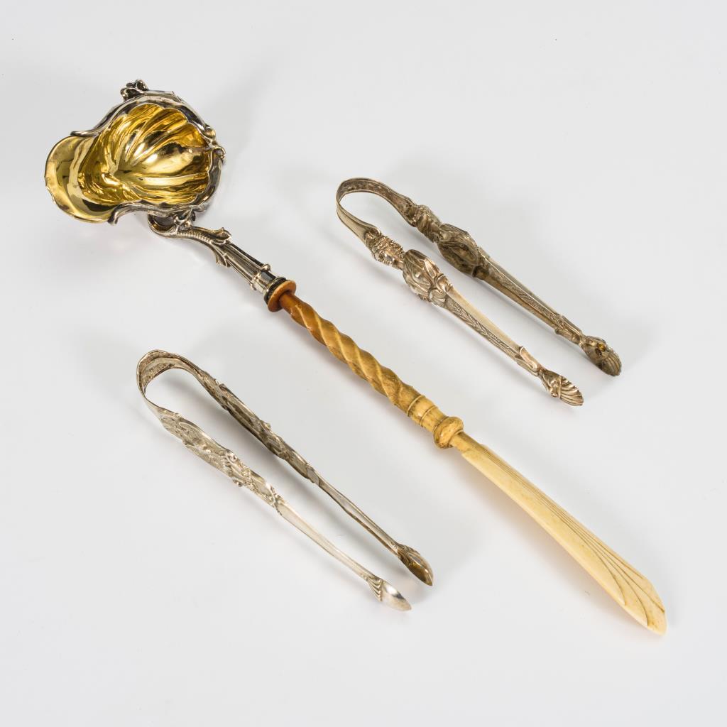 Teilvergoldete Kelle mit Beingriff. Figürlich reliefierte Zuckerzangen. Gebrauchsspuren, 1 Zange alt repariert.