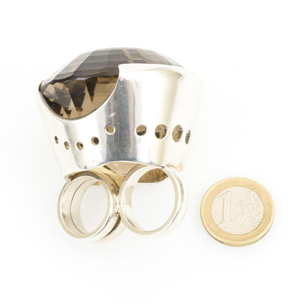 Silber 925 gestempelt. Entwurf: Petri Ruusunen, Turku 2018. Unikale Handarbeit. Rauchquarz 510 ct. Ringkopf 5 x 4 cm. Ringgrößen 60/55. 111,3 g.