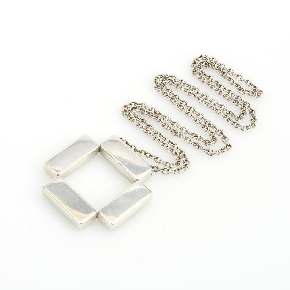 Silber 925 gestempelt. Entwurf: Astrid Fog, Kopenhagen um 1970. Modell Nr. 379. Anhänger 5,5 x 5,5 cm. Kette L 84 cm. 56,2 g.