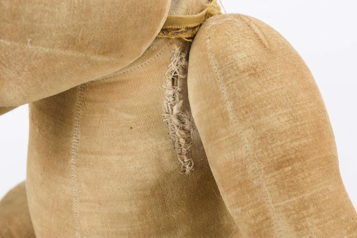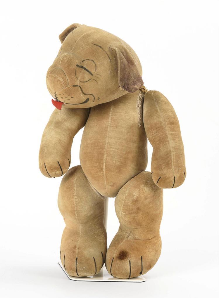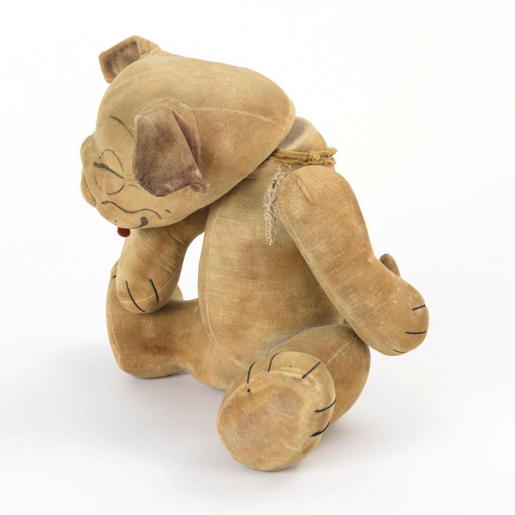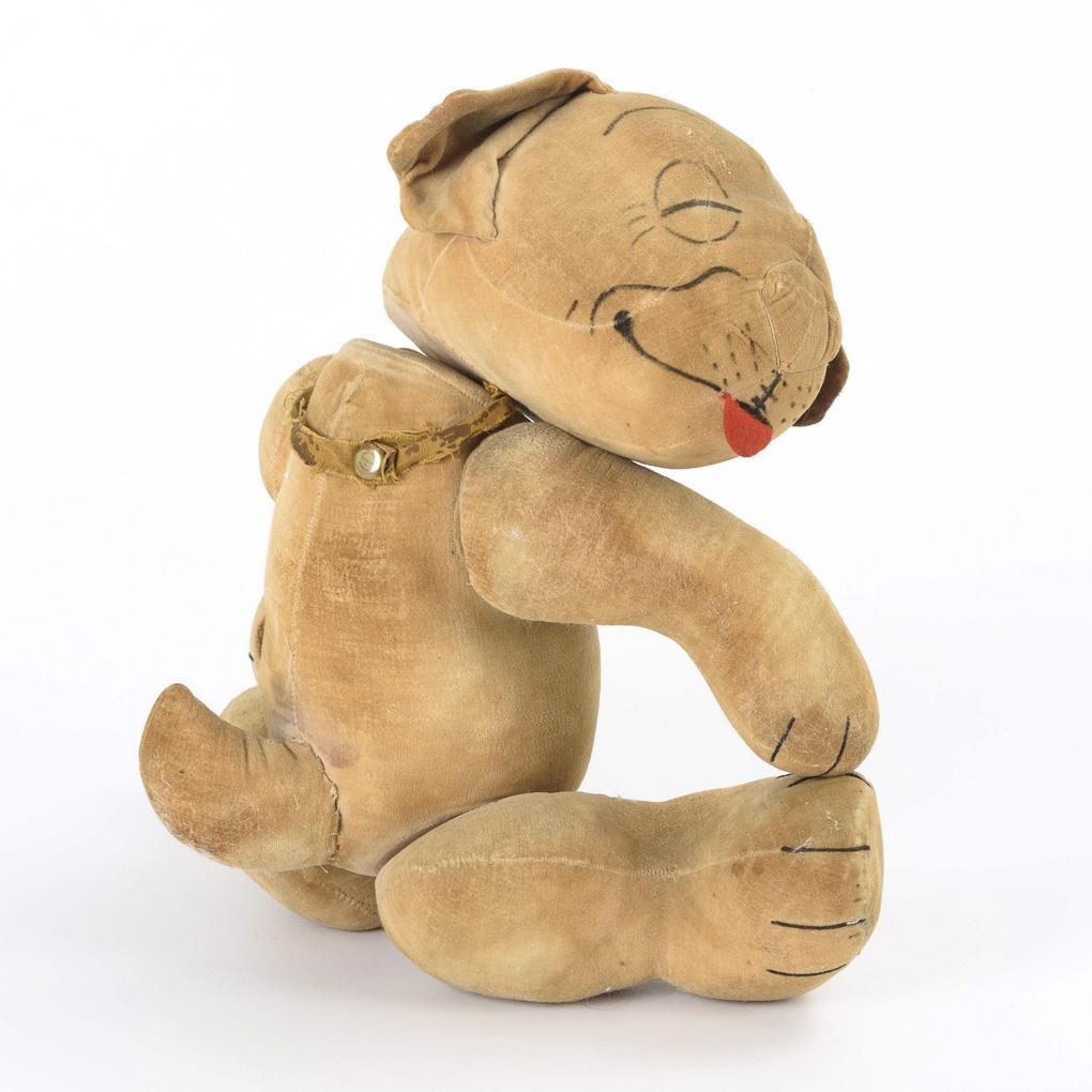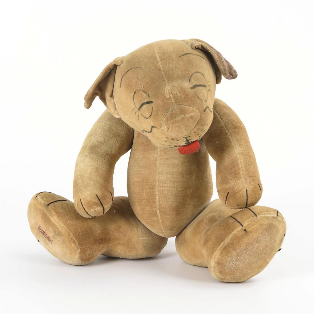 Weicher Samthund mit drehbarem Kopf, Glieder mit Scheibengelenken. Schabloniertes Gesicht mit geschlossenen Augen und heraushängender Zunge. Altersspuren und Reparaturen.