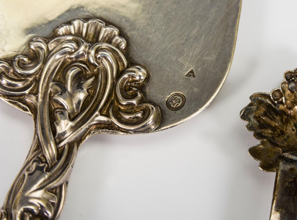 Graviertes und durchbrochen gearbeitetes Biedermeier-Tafelgerät. Alters- und Gebrauchsspuren, 1x alt repariert.