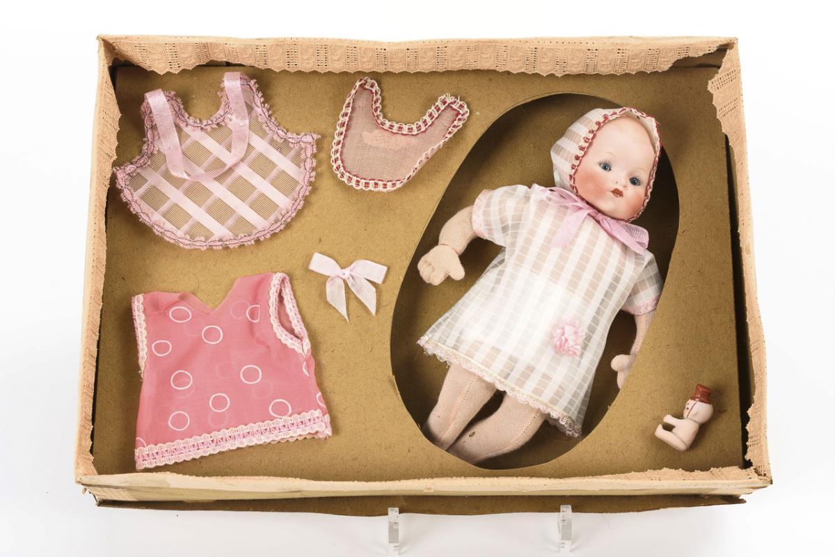 Unbespieltes, originalgeheftetes Dream-Baby mit Einbindekopf, blauen Glasaugen, braun getöntem Haarboden und Stoffkörper. Mit Zubehör und kleinem kewpieartigem Figürchen mit Hut. Karton mit Altersspuren.