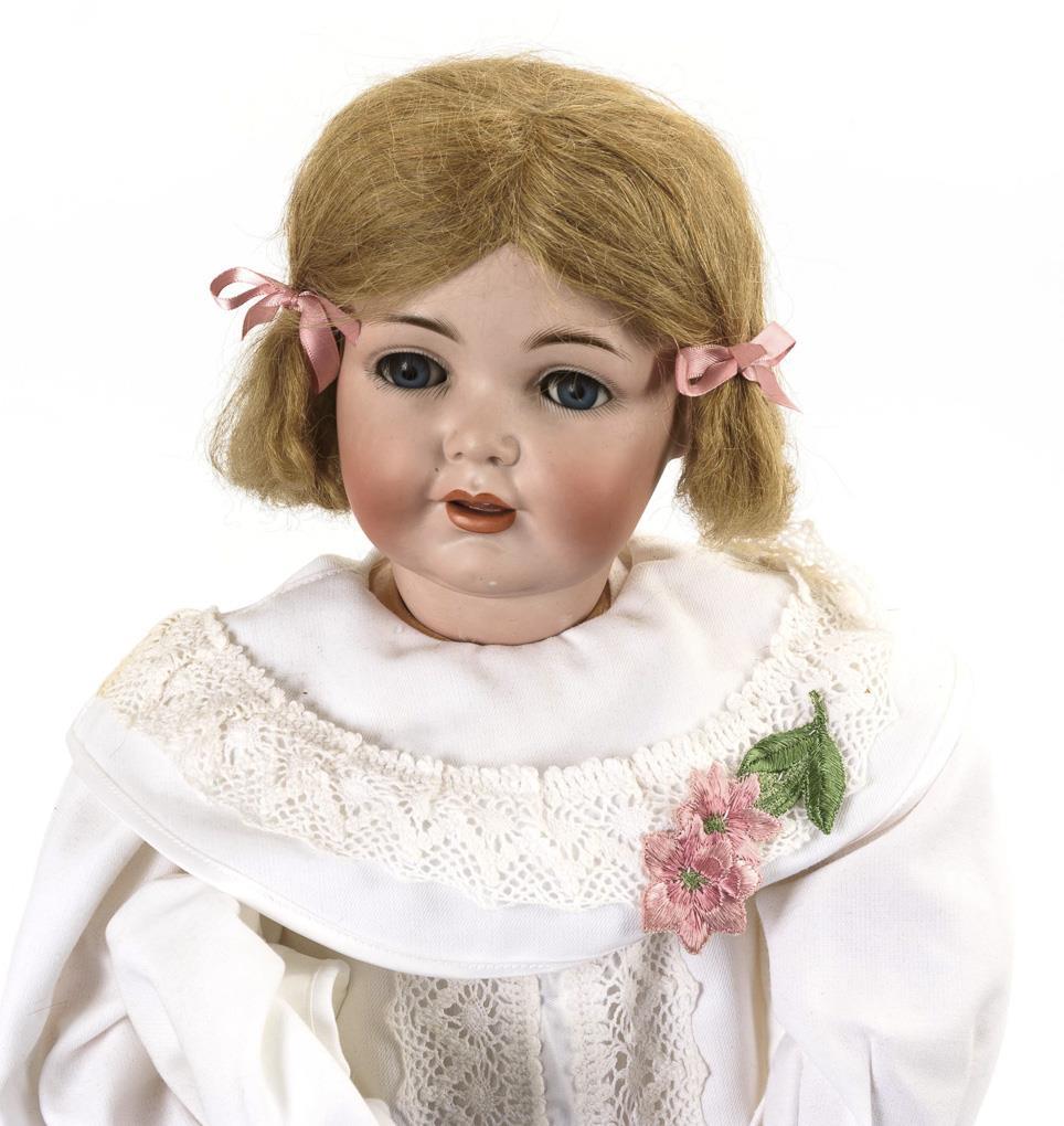 Kurbelkopf, blaue Schlafaugen, Wimpern, bewegliche Zunge, blonde Echthaarperücke. 15-teiliger Gliederkörper. Weißes Kleid, schwarze Lackschuhe. Kopf durchleuchtet: ohne Defekte. Hände übermalt (alt repariert).