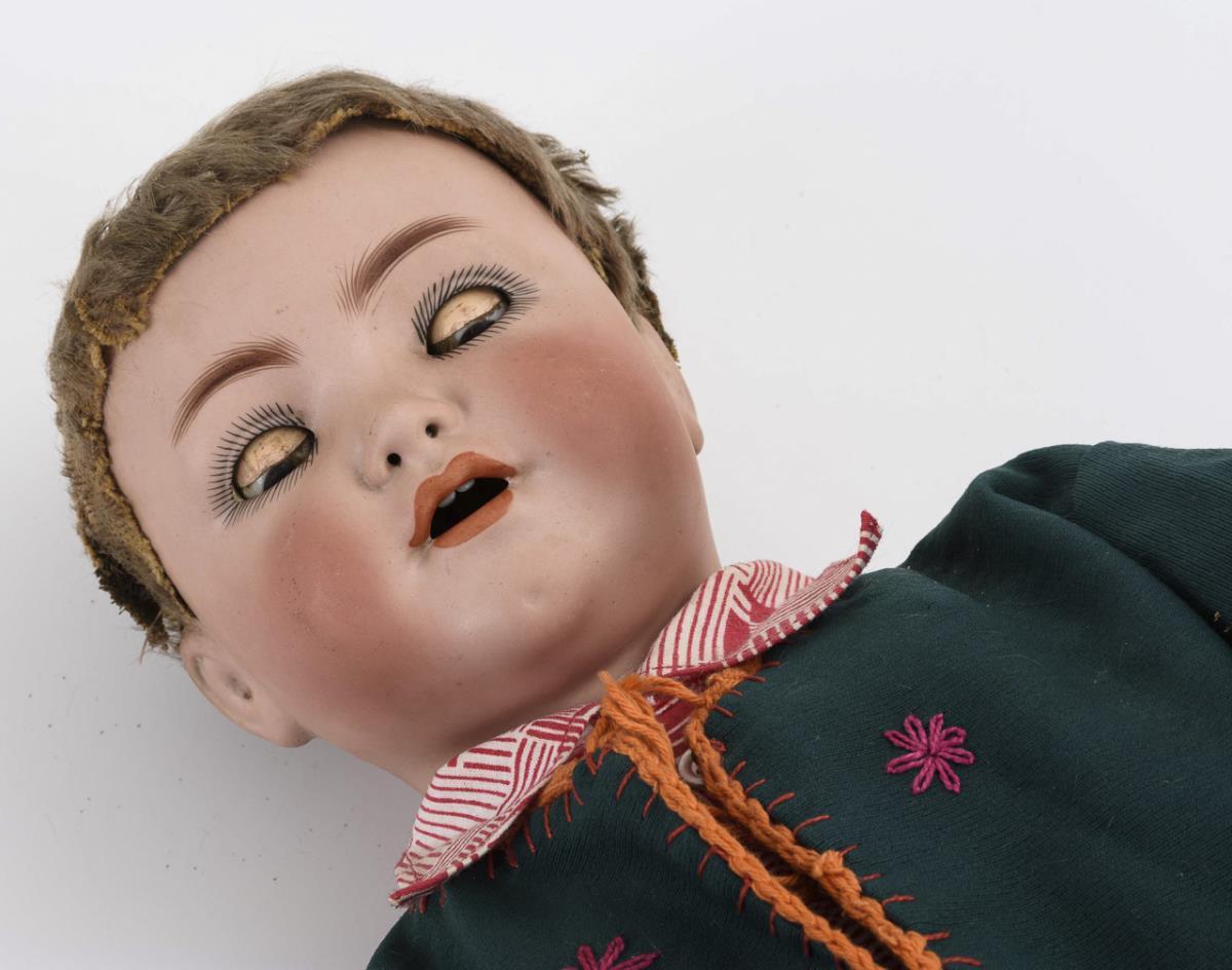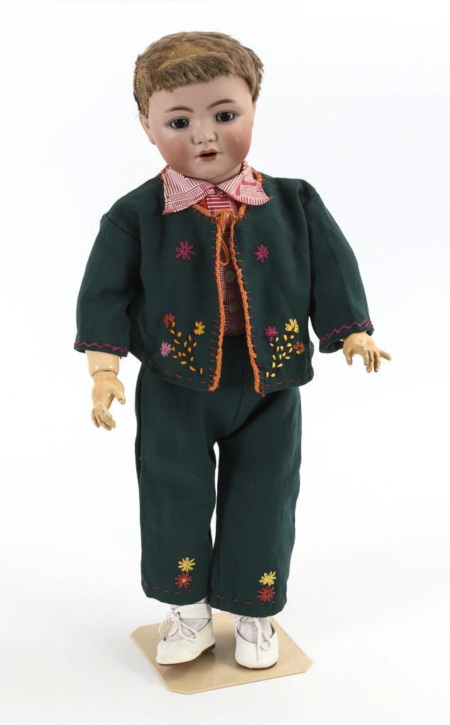 Kurbelkopf, braune Schlafaugen, offene Nasenlöcher, Mohairfell-Perücke mit Fehlstellen. 15-teiliger Toddlerkörper mit rotem Stempel "K & W, Made in Germany". Grüner Anzug mit Stickerei. Kopf durchleuchtet: ohne Defekte. 1 Finger repariert.