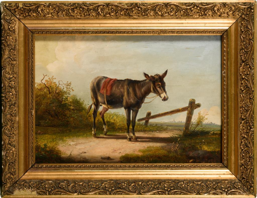 Das Tier an einer Schranke im hellen Sonnenschein. Leichte Altersspuren.