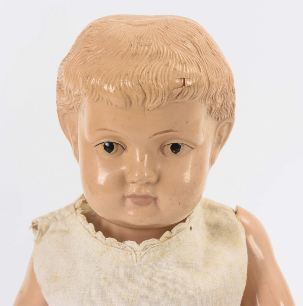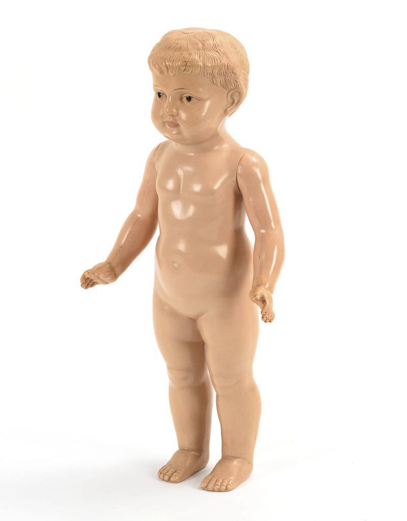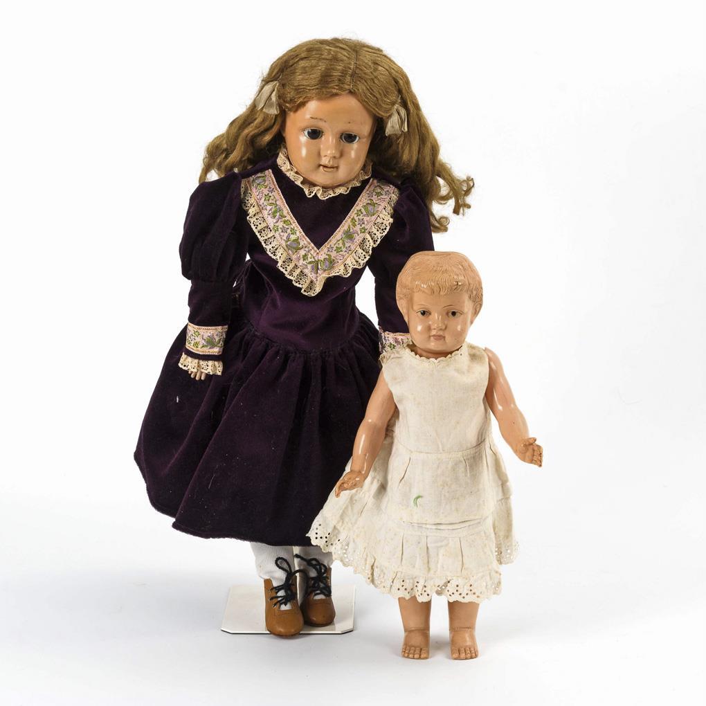 Frühe Stehpuppe mit festem Kopf, gemalten Augen und modellierten Haaren. Weißes Kleid. Brustkopfpuppe mit festen braunen Glasaugen, geschlossenem Mund und blonder Mohairperücke. Stoffkörper mit Celluloidarmen. Jünger ergänztes, dunkelviolettes Samtkleid. Stehpuppe ohne Defekte. Brustkopfpuppe mit Reparatur und kleinen Defekten am Kopf, Arme geklebt.
