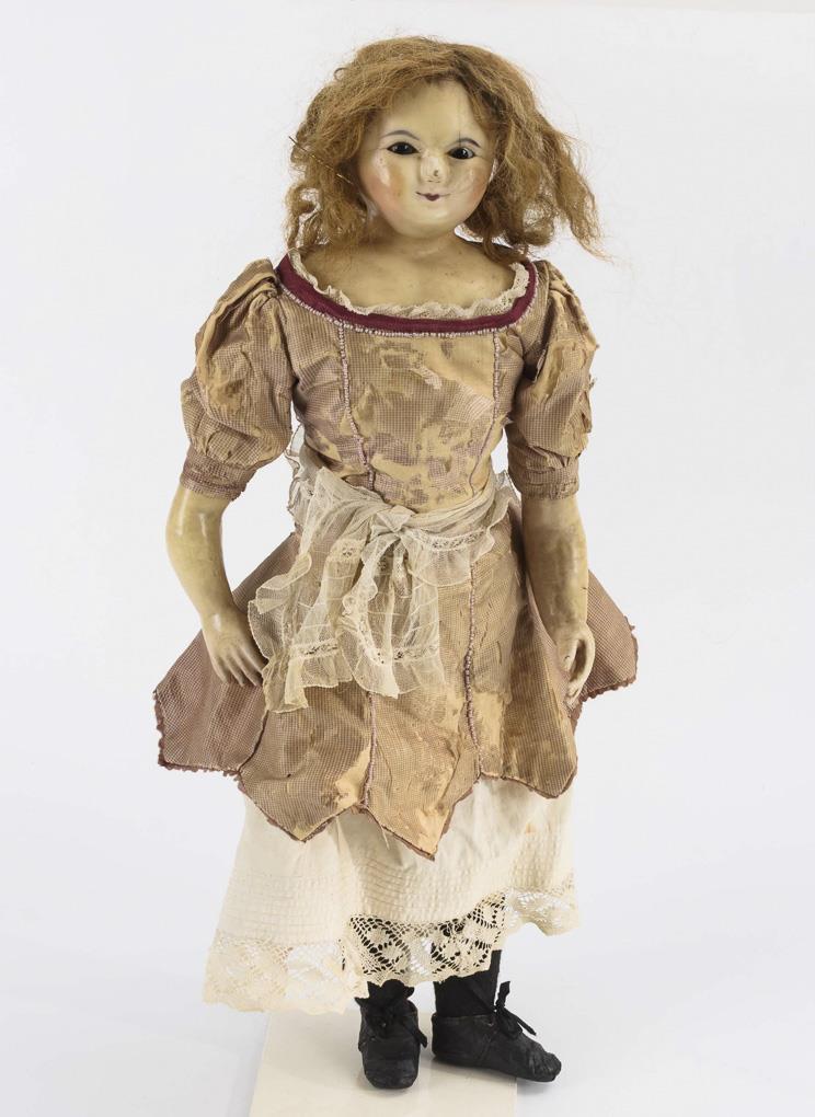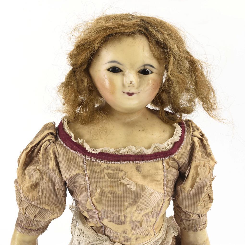Sonneberger Puppe, produziert für den englischen Markt. Brustkopf, eingesetzte braune Augen, geschlossener Mund, Flachshaare. Stoffkörper mit schönen Händen an langen, wachsierten Unterarmen. Altes Kleid mit starken Defekten, schwarze Wachstuchschuhe. Risse im Gesicht und Brustbereich.