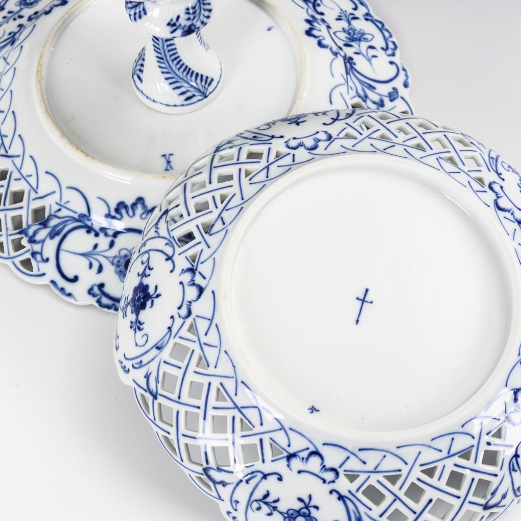 Unterglasurblaue Malerei. Tafelaufsatz H 18,5 cm, Durchbruchschale Ø 24 cm.