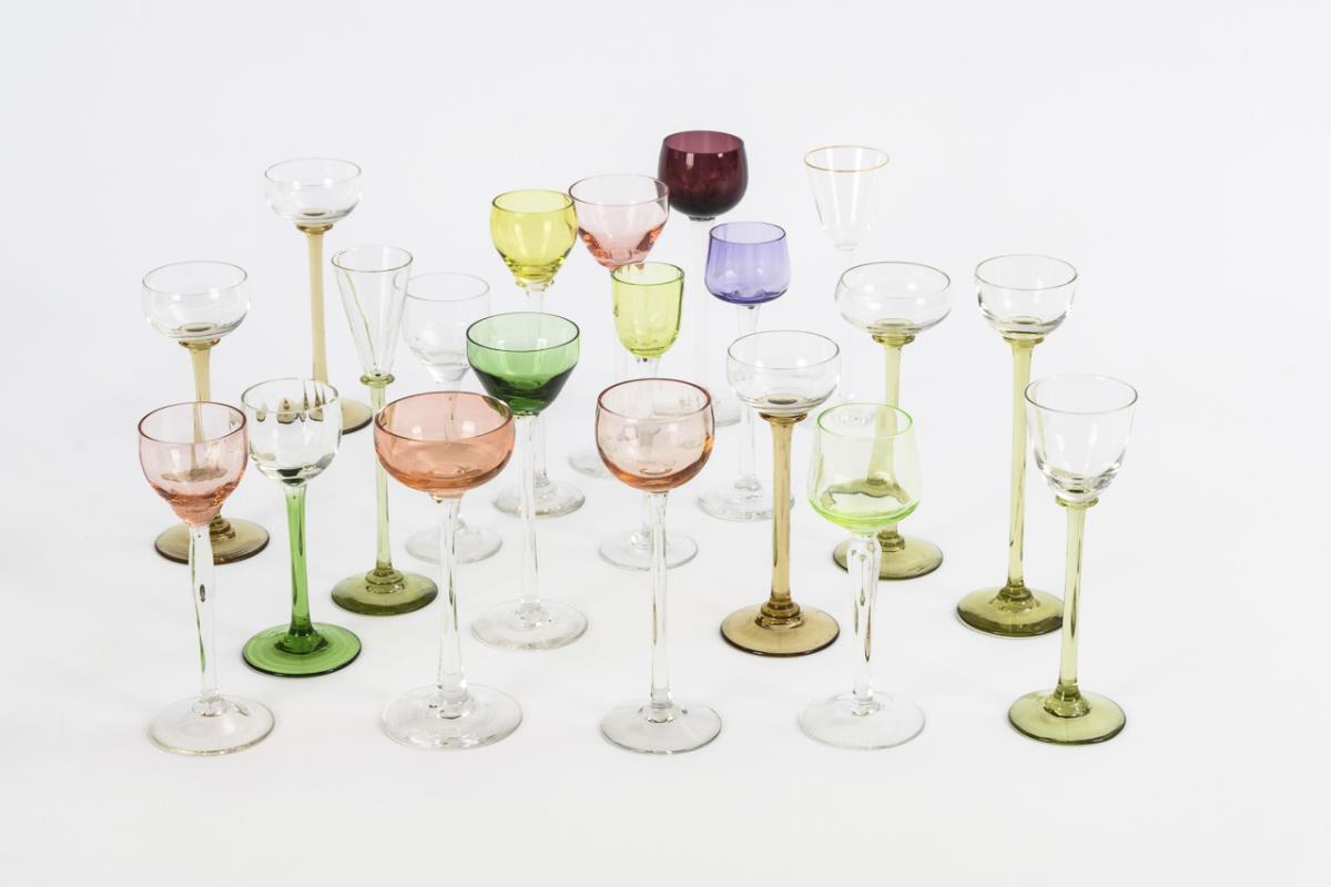 Teils farbige Stängelgläser in verschiedenen Ausführungen.