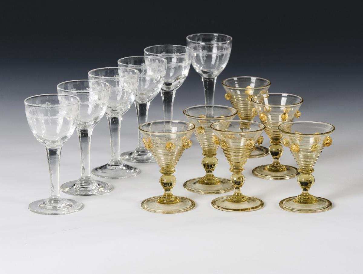 6 Kelchgläser aus farblosem Glas mit floralem Ätzdekor (H 9 cm). / 6 Kelchgläser aus bräunlichem Glas mit aufgeschmolzenem Spiralfaden und fünf aufgeschmolzenen Beerennuppen (H 6,5 cm). 6 Nuppen fehlen.