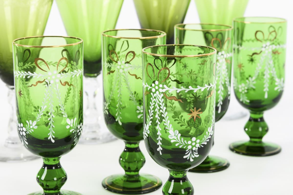 Farbloses und grünes Glas, Ätzdekor bzw. weiße Emailmalerei, teils Goldstaffage. H 11,5 und 14,5 cm.