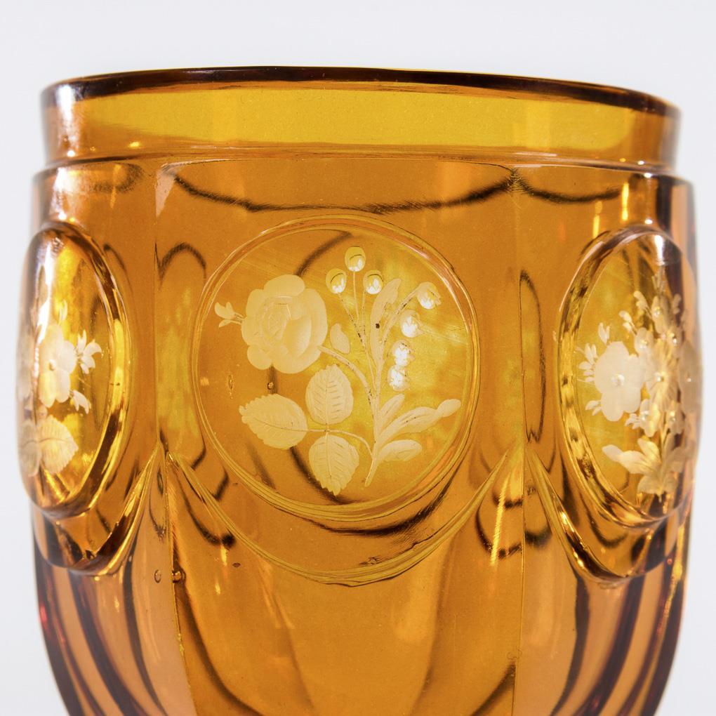 Sechsfach facettiertes Glas mit ovoider Kuppa, nodiertem Schaft und mehrpassigem Fuß. In sechs hochgeschliffenen Medaillons kleine gravierte, teils geblänkte Blumenbuketts. Mündungsrand beschliffen.