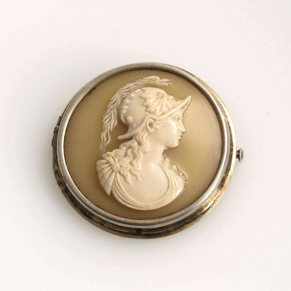 Zargengefasste Achat?kamee mit antikisierend geschnittenem Minerva-Profilkopf. Schiebehaken.