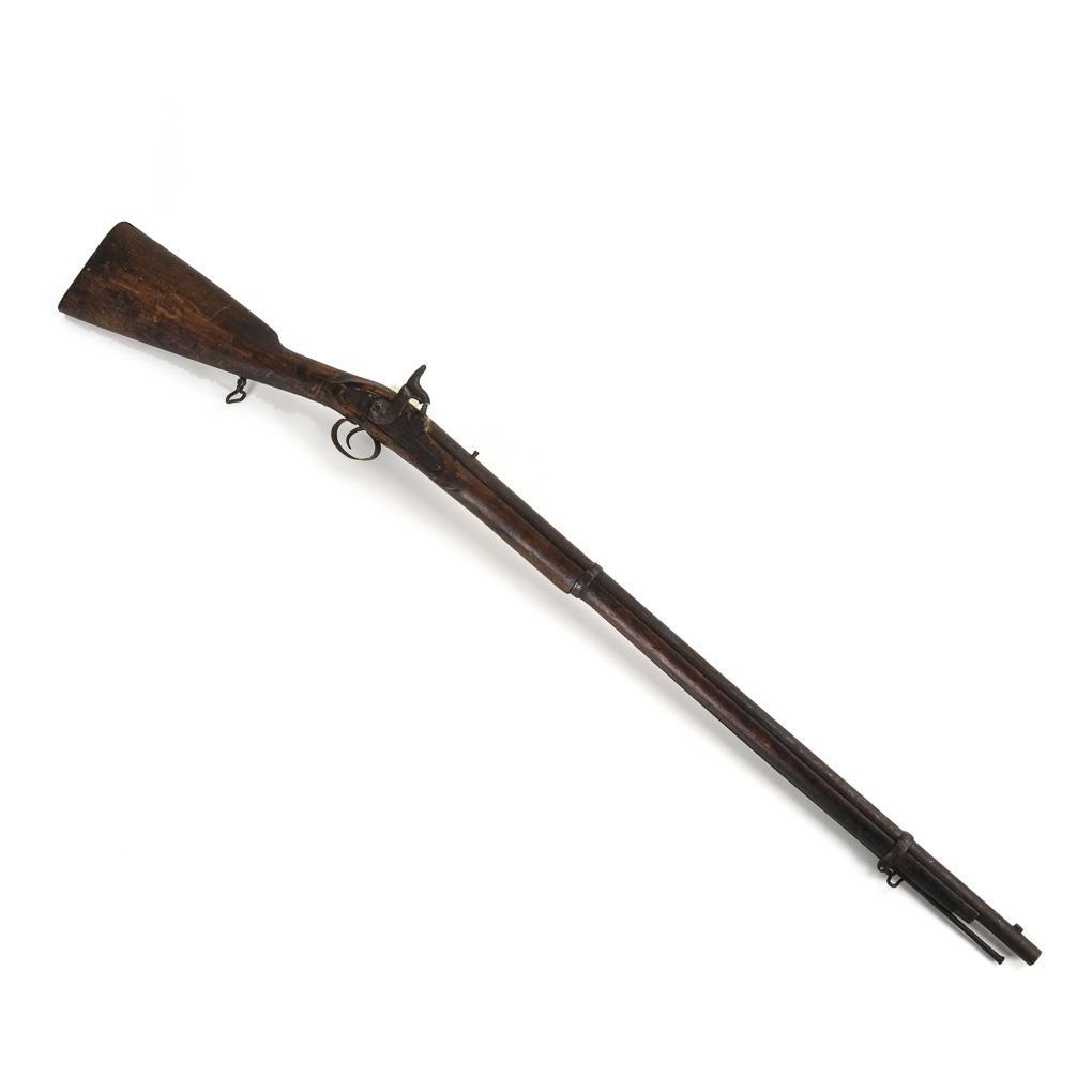 Glatter Lauf mit eingeschlagener Nummer "103/63", Holzschaft mit "IMP DWS / VI/ 103/63". Zeitgenössische Reparaturarbeiten. Gegenschloss ergänzt und genagelt. Ladestock aus Metall. Funktion nicht geprüft.