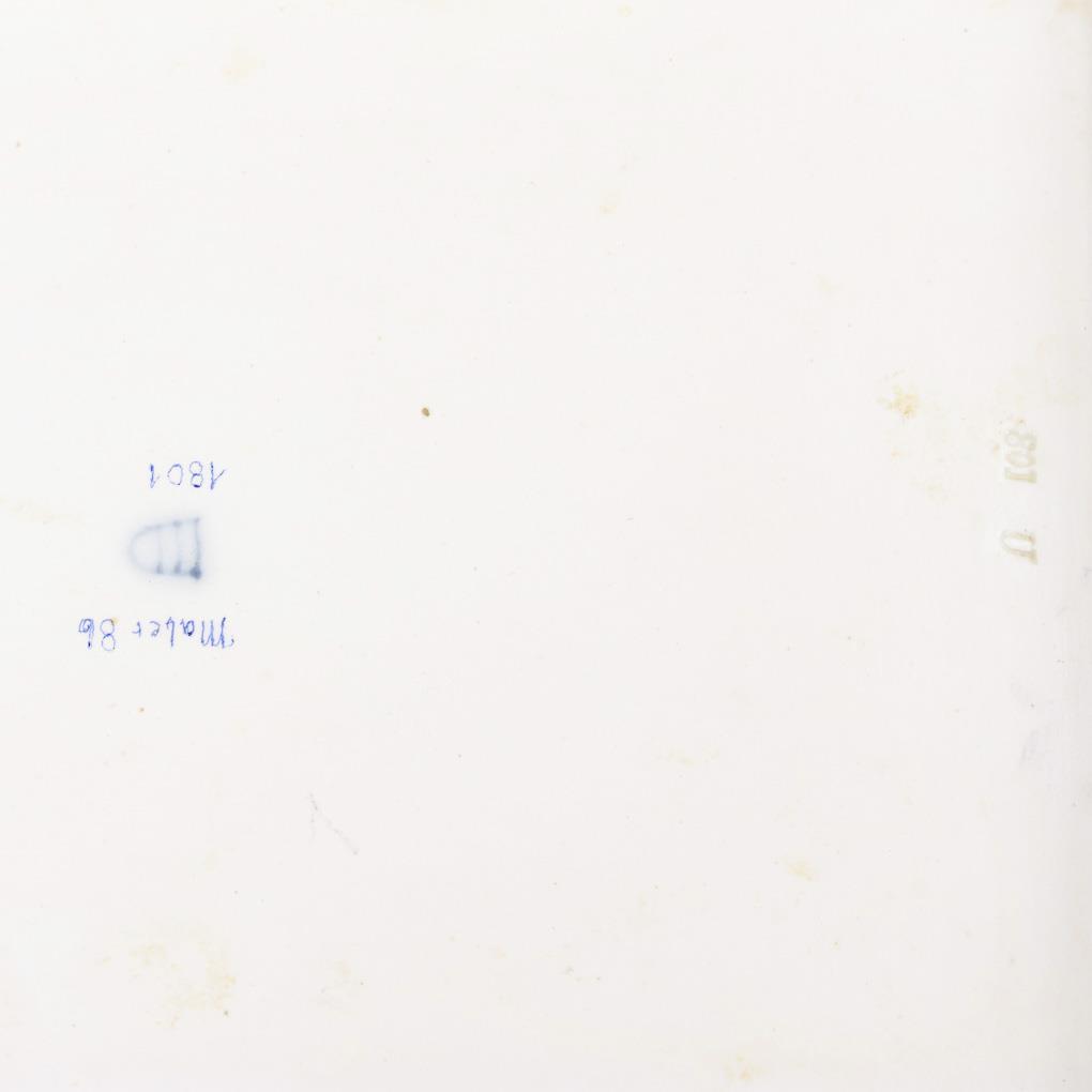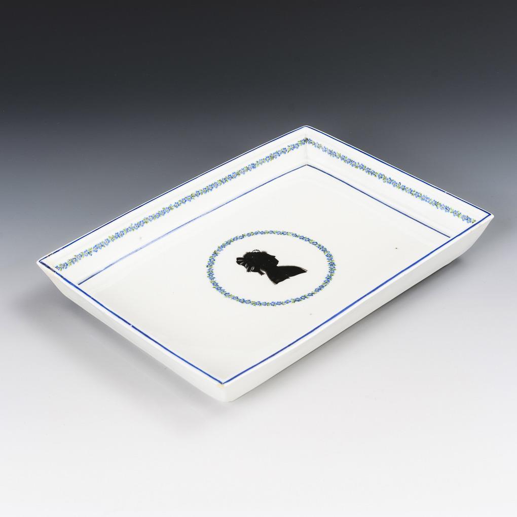 Rechteckiges Tablett mit konischer Fahne. Im Spiegel ein von Vergißmeinnichtblüten gerahmtes Medaillon mit dem in Scherenschnittoptik schwarz gemalten Porträt einer Dame, Vergißmeinnichtband auf der Fahne. 1 Ecke mit geklebtem Ausbruch, 2 kleine Randrestaurierungen, 2 Randchips.