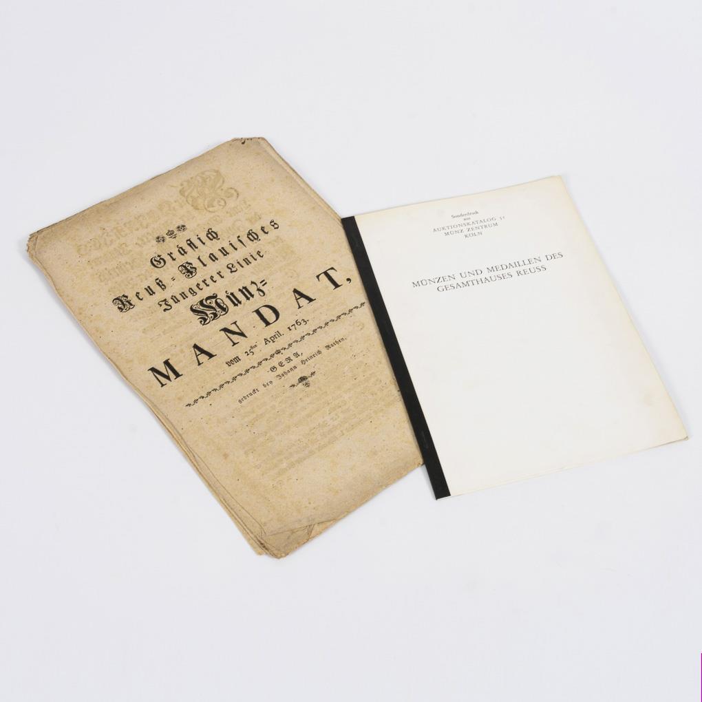 "Gräflich-Reuß-Plauisches Elterer und Jüngerer Linie Münz-Mandat, wegen Bezahlung derer, während Kriegs in geringhaltigen Münz-Sorten contrahirten Schulden, gegen Reduction nach dem Conventions-Fuß, vom 17. August 1763", 8 Seiten. / "... Münzmandat vom 25. April 1763", 8 Seiten. / "Münzen und Medaillen des Gesamthauses Reuss", Sonderdruck aus Auktionskatalog 51, Münz Zentrum Köln, 12 Seiten, 26,5 x 18,5 cm.