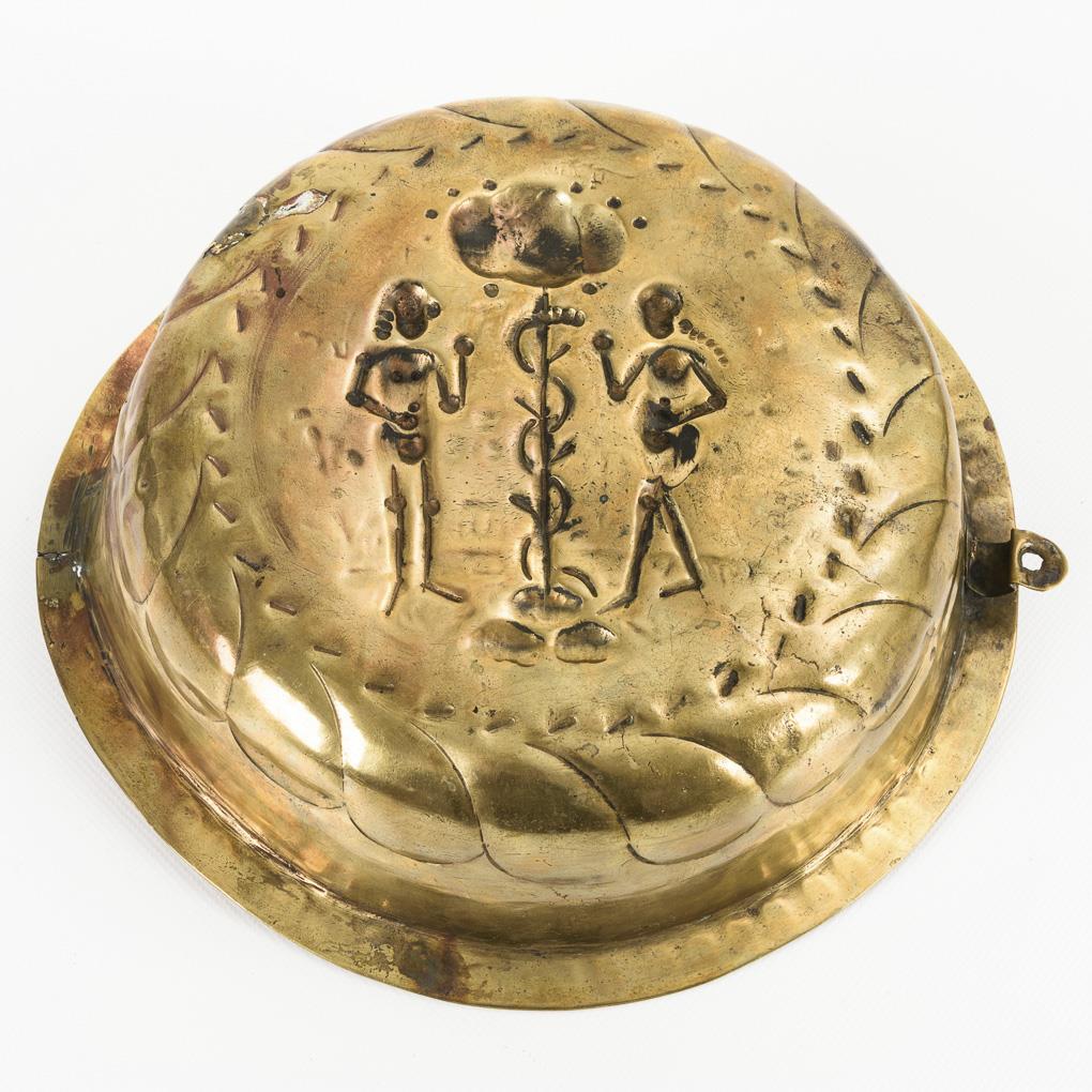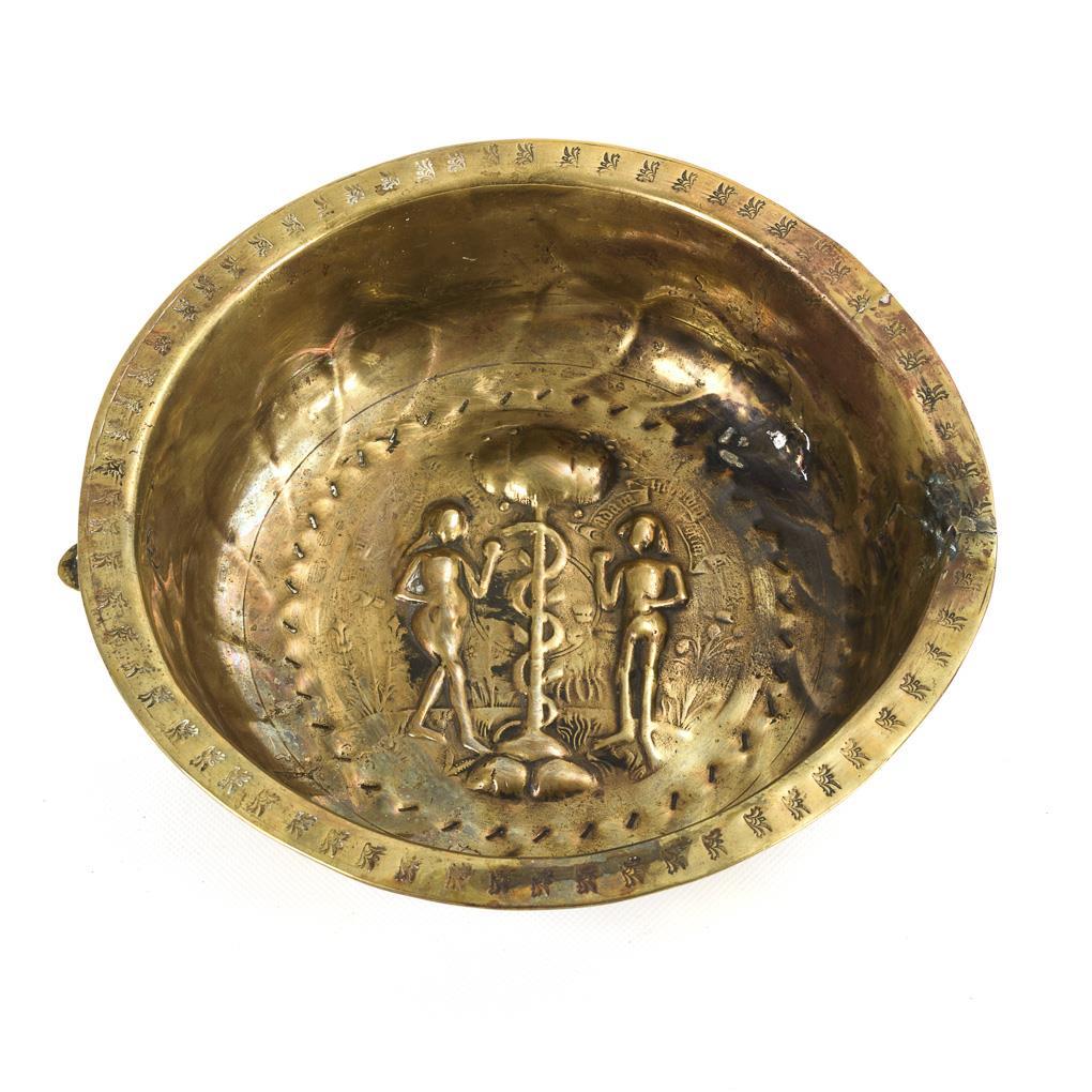 Adam und Eva unter Schriftbändern am Baum mit der Schlange. Godronierter Wandungsansatz, Punzen auf der schmalen Fahne. Starke Alters-/Gebrauchsspuren, alte Lötreparaturen, 1 minimaler Haarriss, teils durchputzt, alt angenietete Öse.