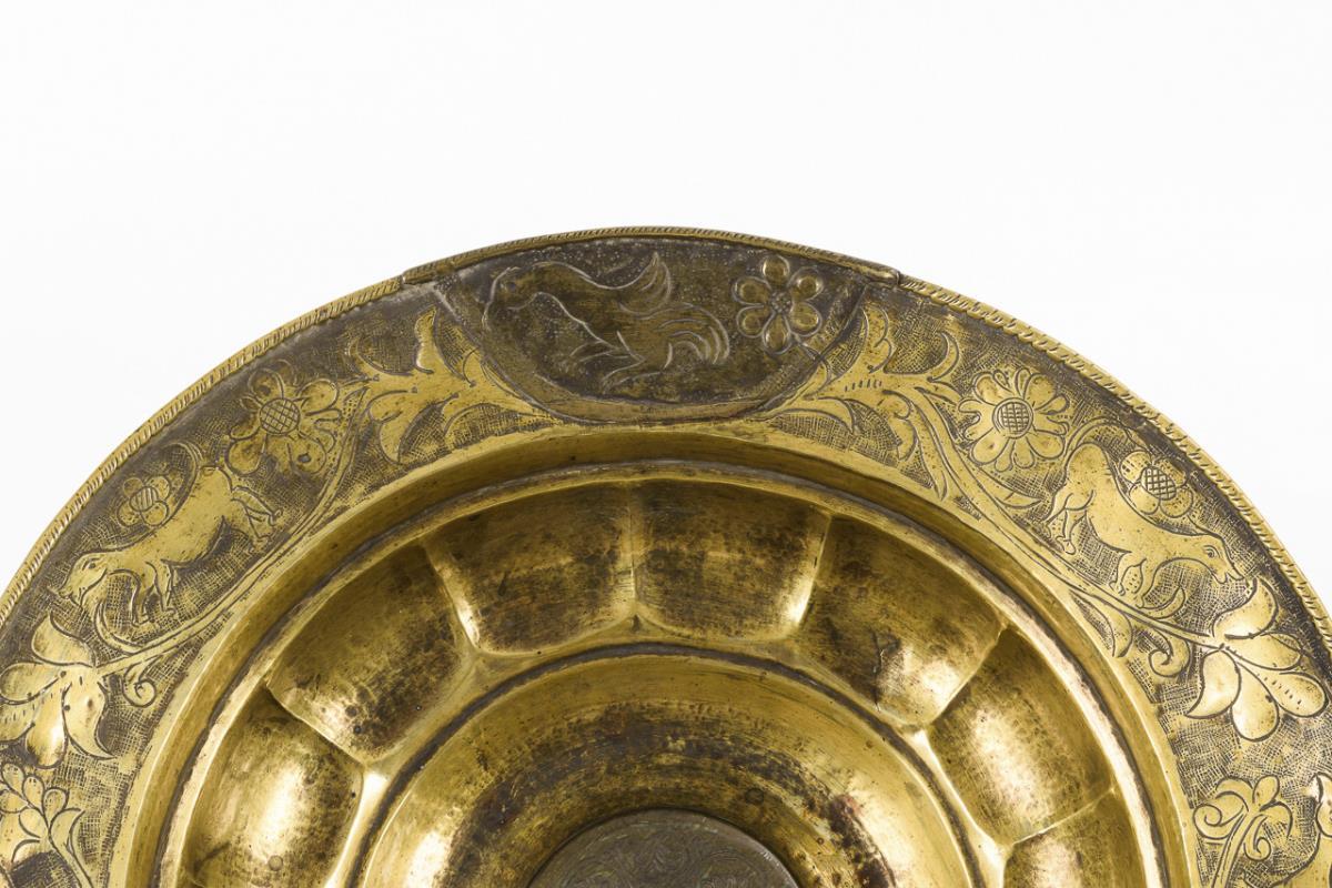 Messing frei getrieben und gepunzt, gebördelter Rand mit Eisendraht. Ø 40 cm, H 12 cm.