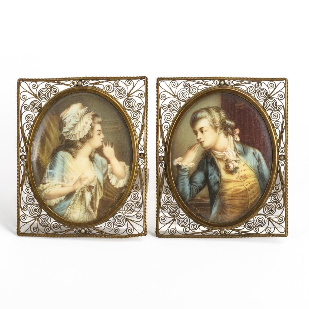 Übermalte Vordrucke auf Elfenbein(?), beidseitig verglaste Rahmen aus Messing-Filigran. 8 x 6,5 cm, Rahmen 10 x 8 cm.