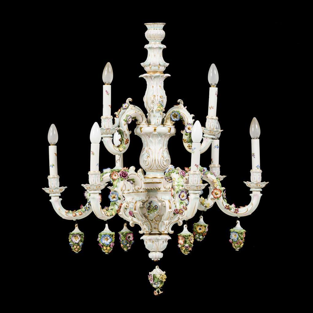 9-flammiger, rocaillereliefierter und reich mit Blüten belegter elektrischer Leuchter mit s-förmig geschwungenen, zweireihig angeordneten Leuchterarmen und Blütenabhängungen. Wenige Bestoßungen am Belag.