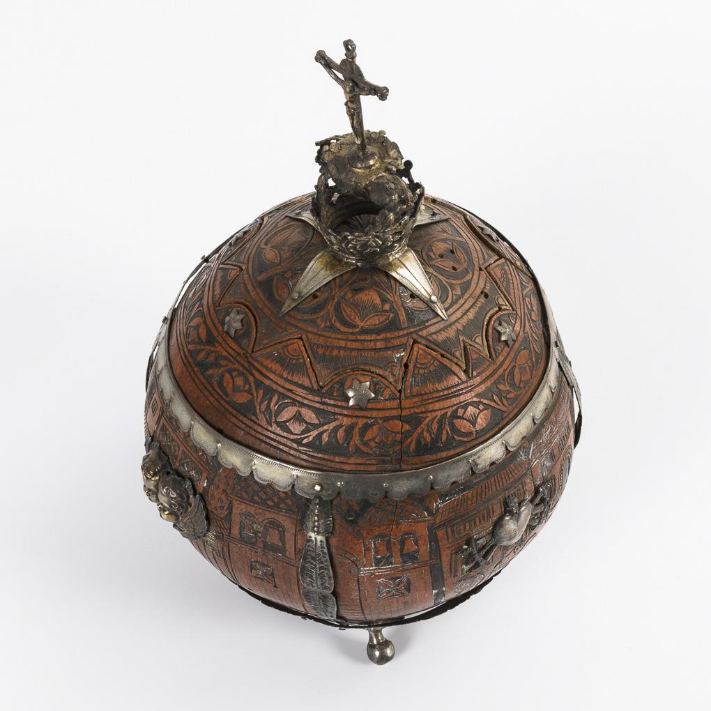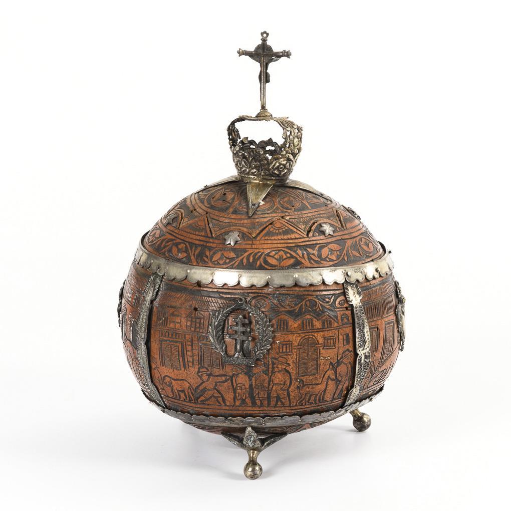 Dose vollständig mit Architektur, Menschen, Tieren und Ornament graviert. Kugelfüße, Zierstreifen-Rahmung, Appliken (Papstkreuz, Herz Mariä, Engelsflüchte, leeres Wappenschild) sowie Krone mit Kruzifix. Anobienspuren, einige Haarrisse am Kürbis, kleine Risse am Kronenbügel, Appliken wohl nachträglich.