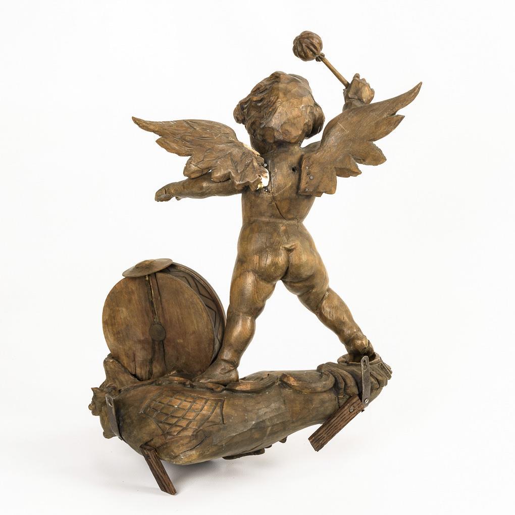 Mit kraftvollem Ausfallschritt und erhobenem Schlegel musizierender Engel. Flügel und Schlegelkopf abgebrochen, kaum Trockenrisse.