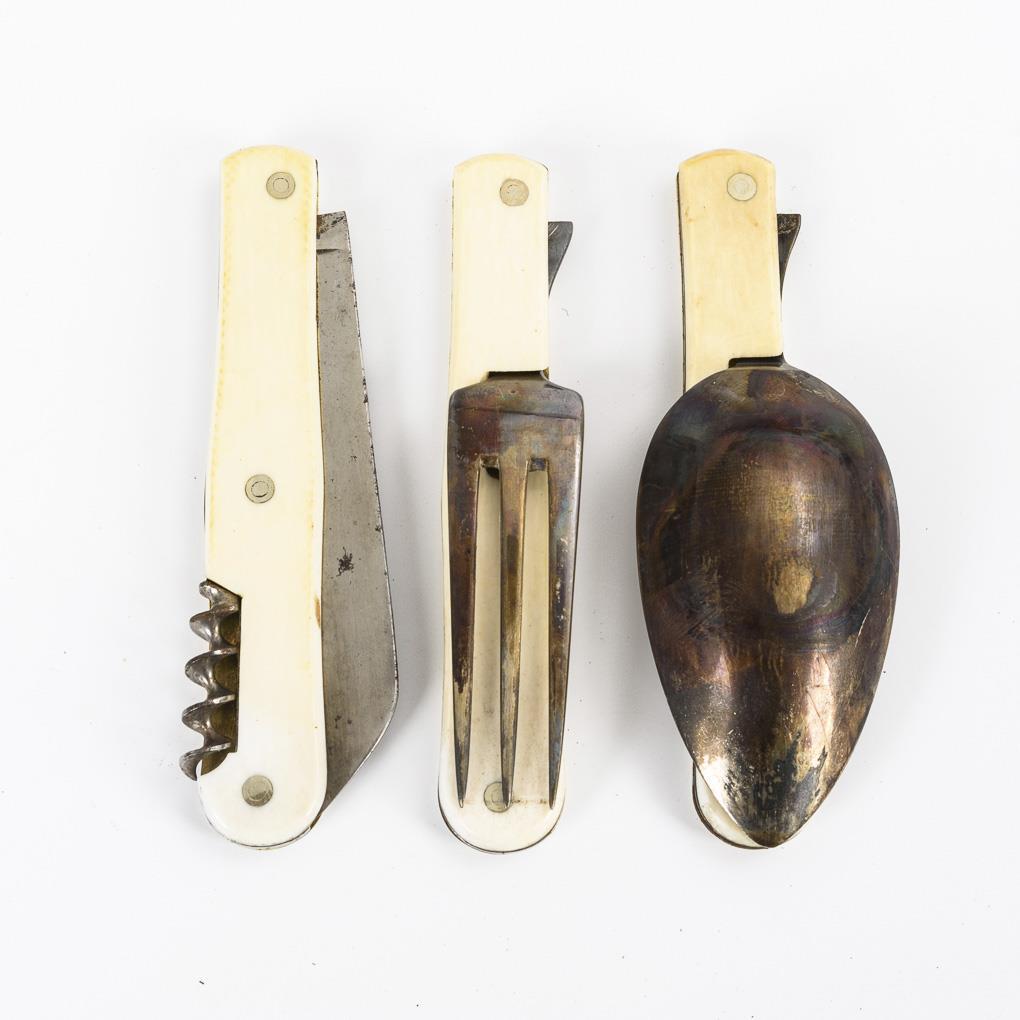 Ausklappbares Besteck im schwarzen Lederetui. Leichte Rostspuren, wenige Alters-/Gebrauchsspuren.