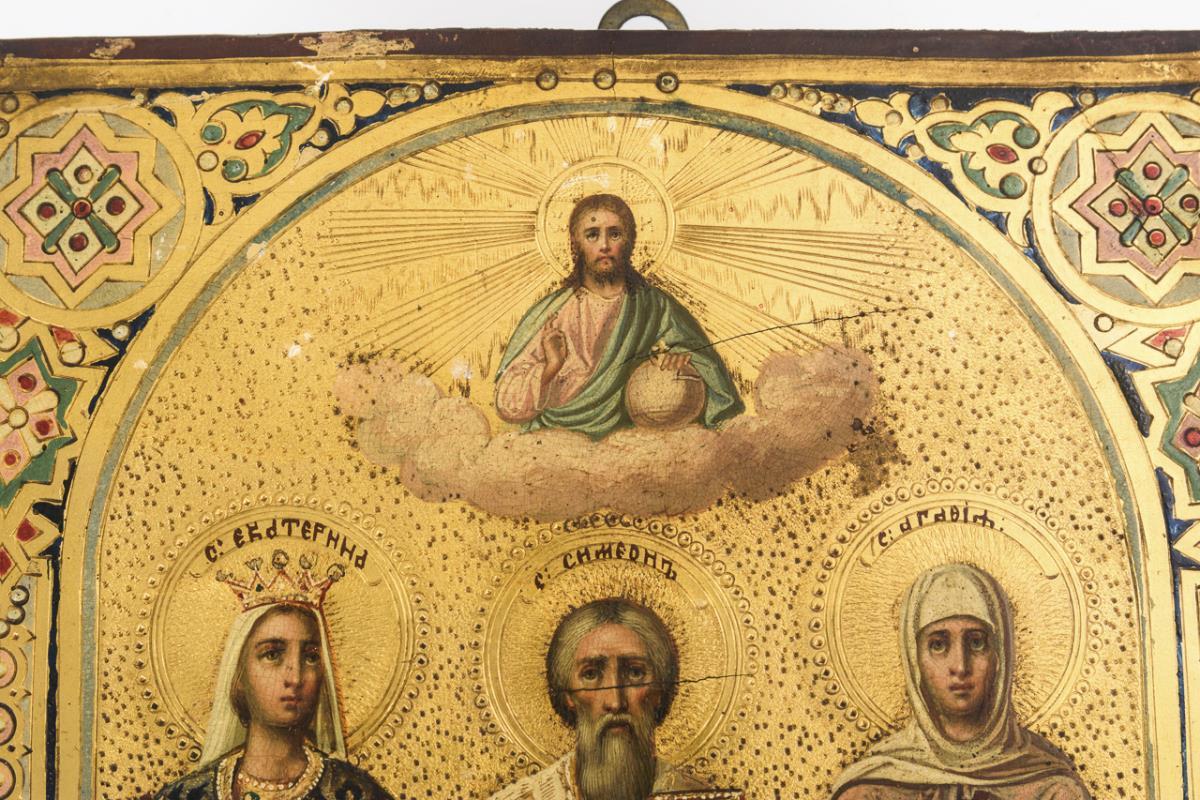 Drei Heilige unter Christus Pantokrator. Trockenrisse, Alters-/Gebrauchsspuren.