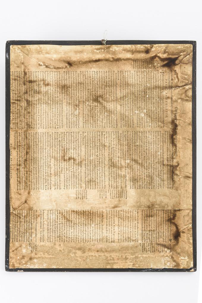 Urinierender Mann neben Grabstelle mit Blick zur Kirche; dazu Spottreim. Malerei-Schwundrisse, kleine Fehlstellen am ergänzten(?) Rahmen.