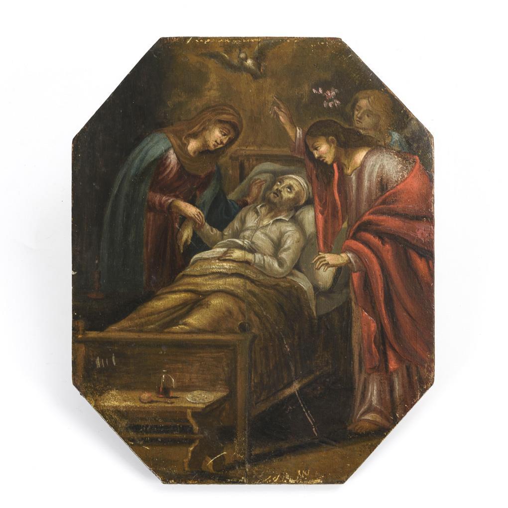 Joseph im Bett zwischen Maria und Christus, darüber die Heilig-Geist-Taube. Altersspuren.