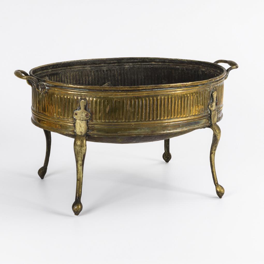 Ovales Blumengefäß mit Messingfüßen, -griffen und geriffelter -wandung sowie ergänztes Sperrholzbrett über dem gewölbten Kupferboden. Alters-/Gebrauchsspuren.