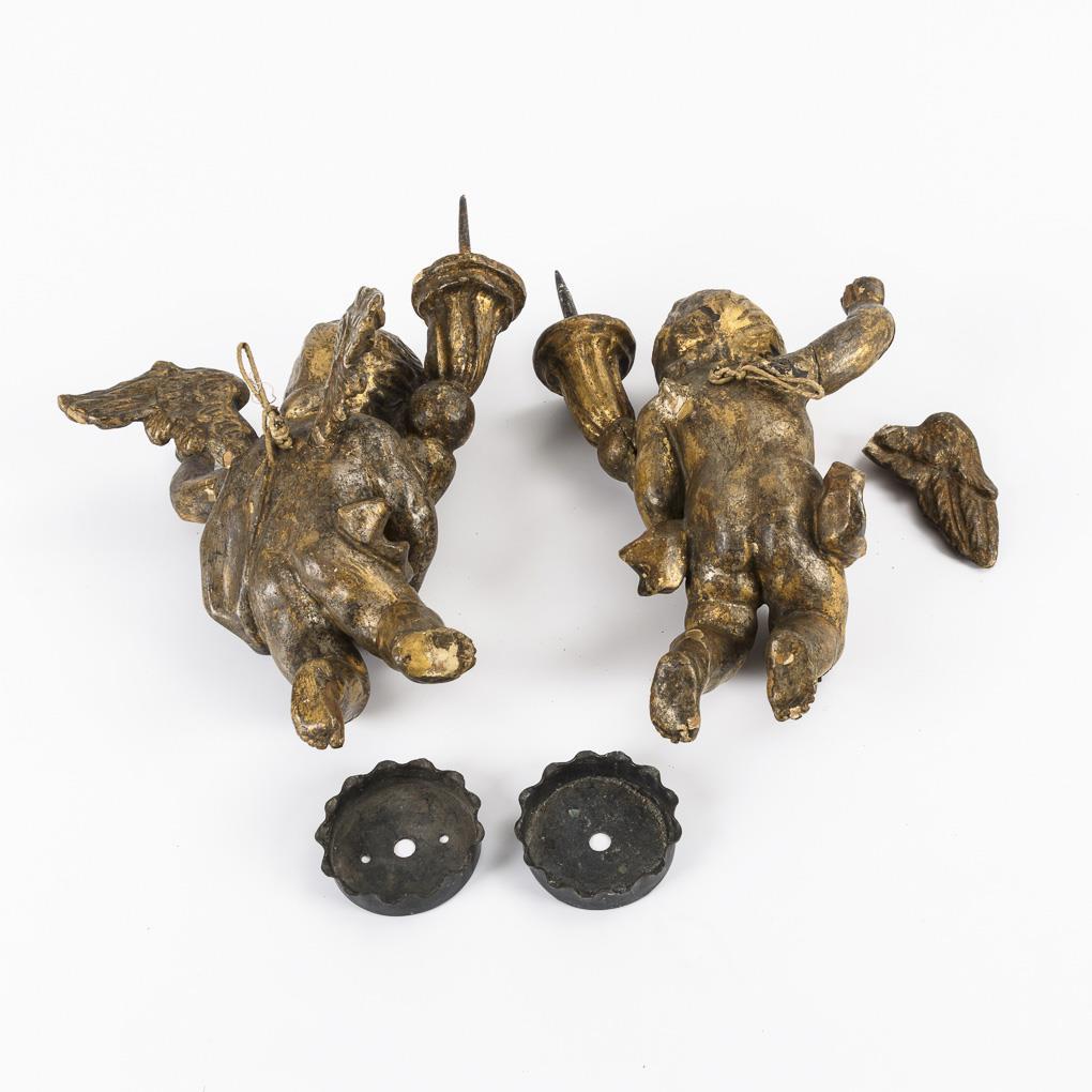 Spiegelbildlich gestaltete Putten; je mit füllhornähnlichem Leuchter. 1 Flügel fehlt, 1 lose anbei, geklebte Risse, Zeigefinger fehlen, Fassungsschäden.