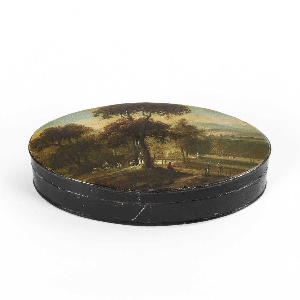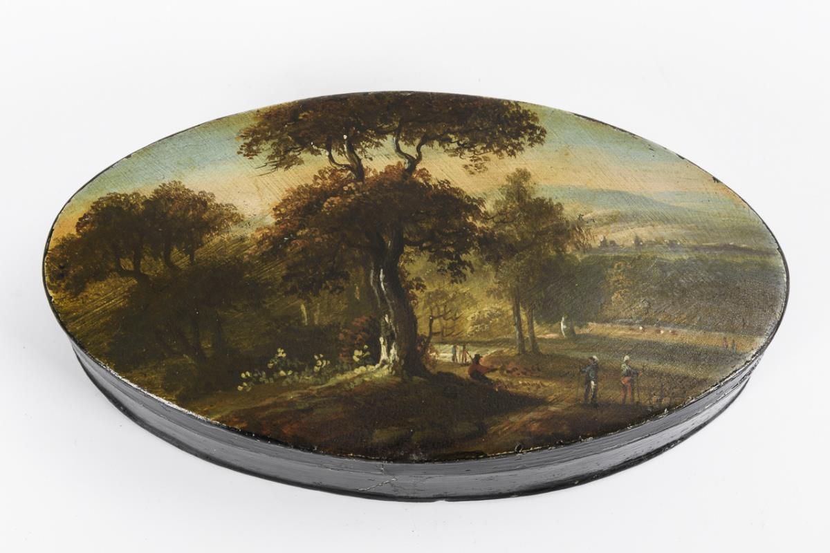 Auf dem Deckel weite Landschaft mit Staffage. Korpus bis auf Malerei überlackiert, einige Alters-/Gebrauchsspuren.