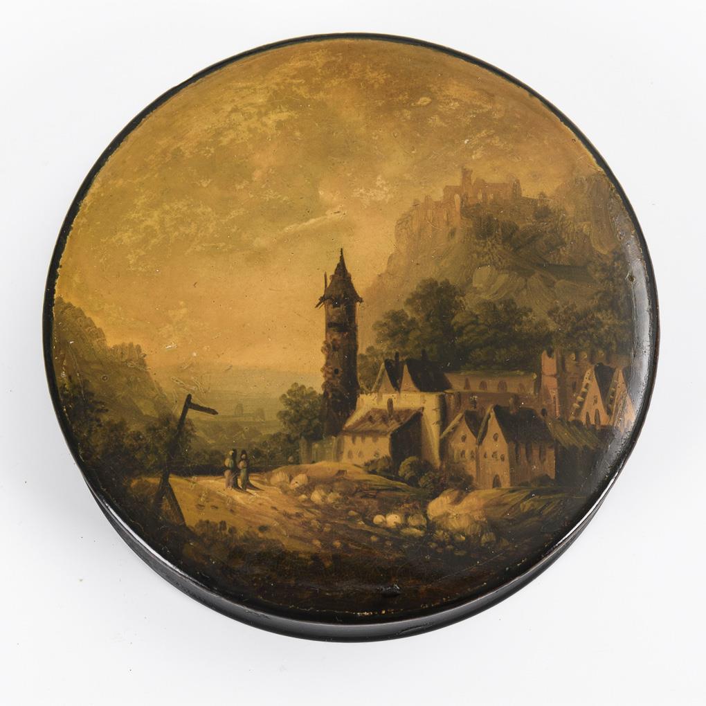 Runde Lackdose mit romantischer Landschaft.