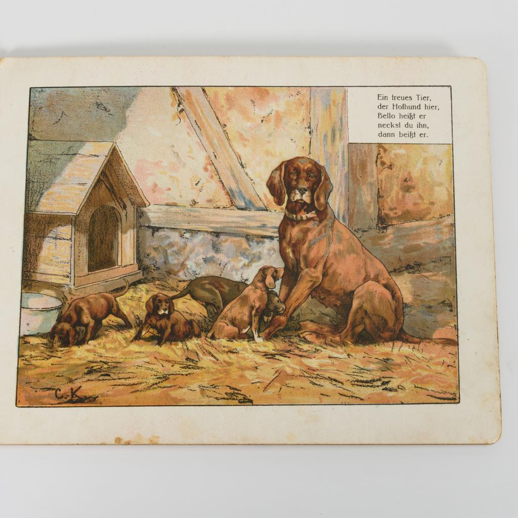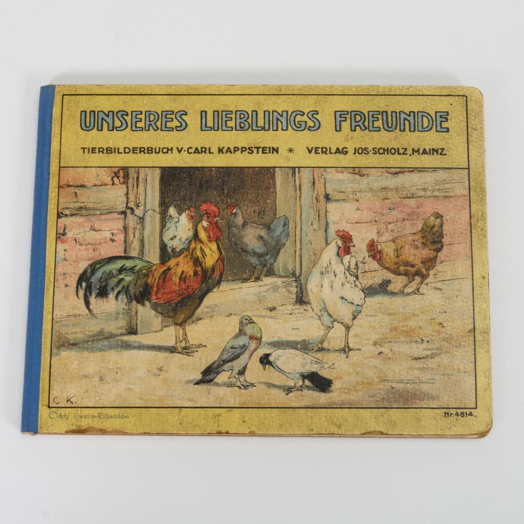 Scholz Künstler-Kinderbücher. 5 Hartpappblätter mit Farblithographien und kleinen Versen. Tiere auf dem Bauernhof. Halbleineneinband, vorderes Gelenk nachgeklebt, sonst altersgemäß gute Erhaltung.