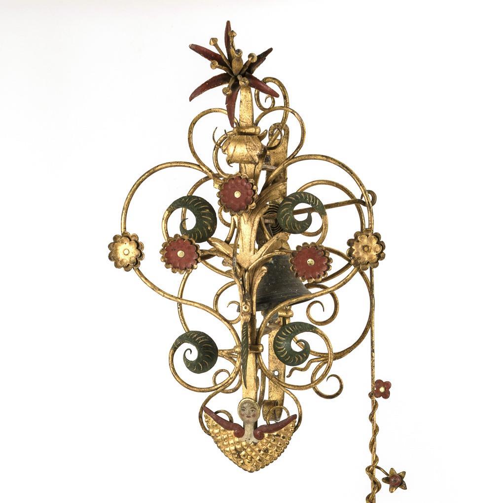 Schmiedeeisen goldbronziert, teils bemalt. Bronzeglocke. 59 x 39 x 30 cm, Zugstab L 104 cm.
