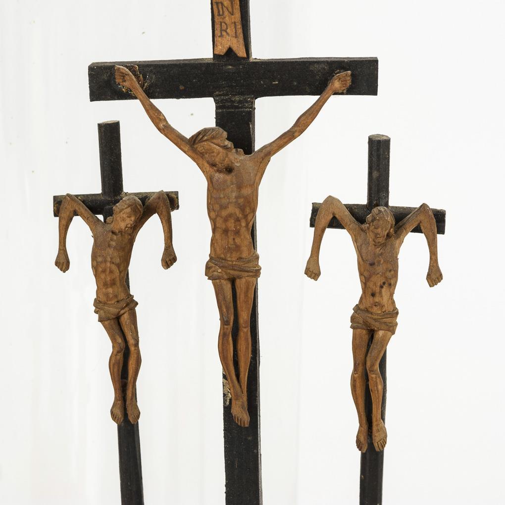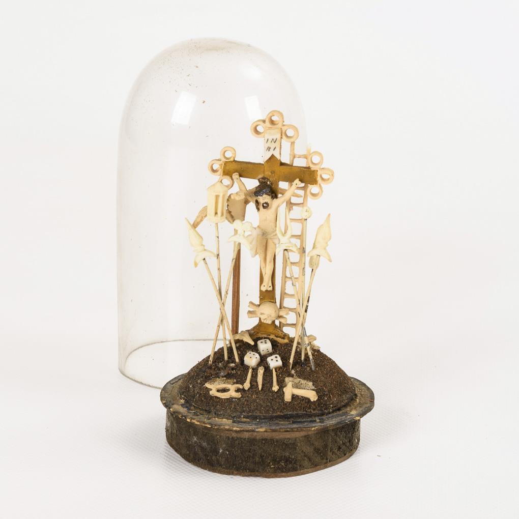 Große "Arma Christi" mit feinen Spiralverzierungen aus Holzspänen. / Kleine "Arma Christi" aus Masse. / Geschnitzter Kalvarienberg (Berchtesgaden?). 1 Glassturz fehlt, kleiner Glassturz ergänzt. Arma Christi je mit Fehlstellen und Defekten.