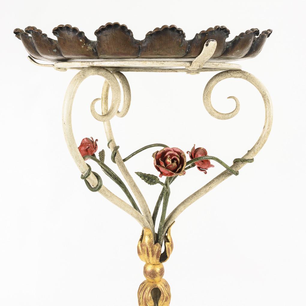 Schmiedeeisen bemalt, teils goldbronziert. Kupferschale getrieben und gepunzt. H 78 cm, Ø Schale 35 cm.