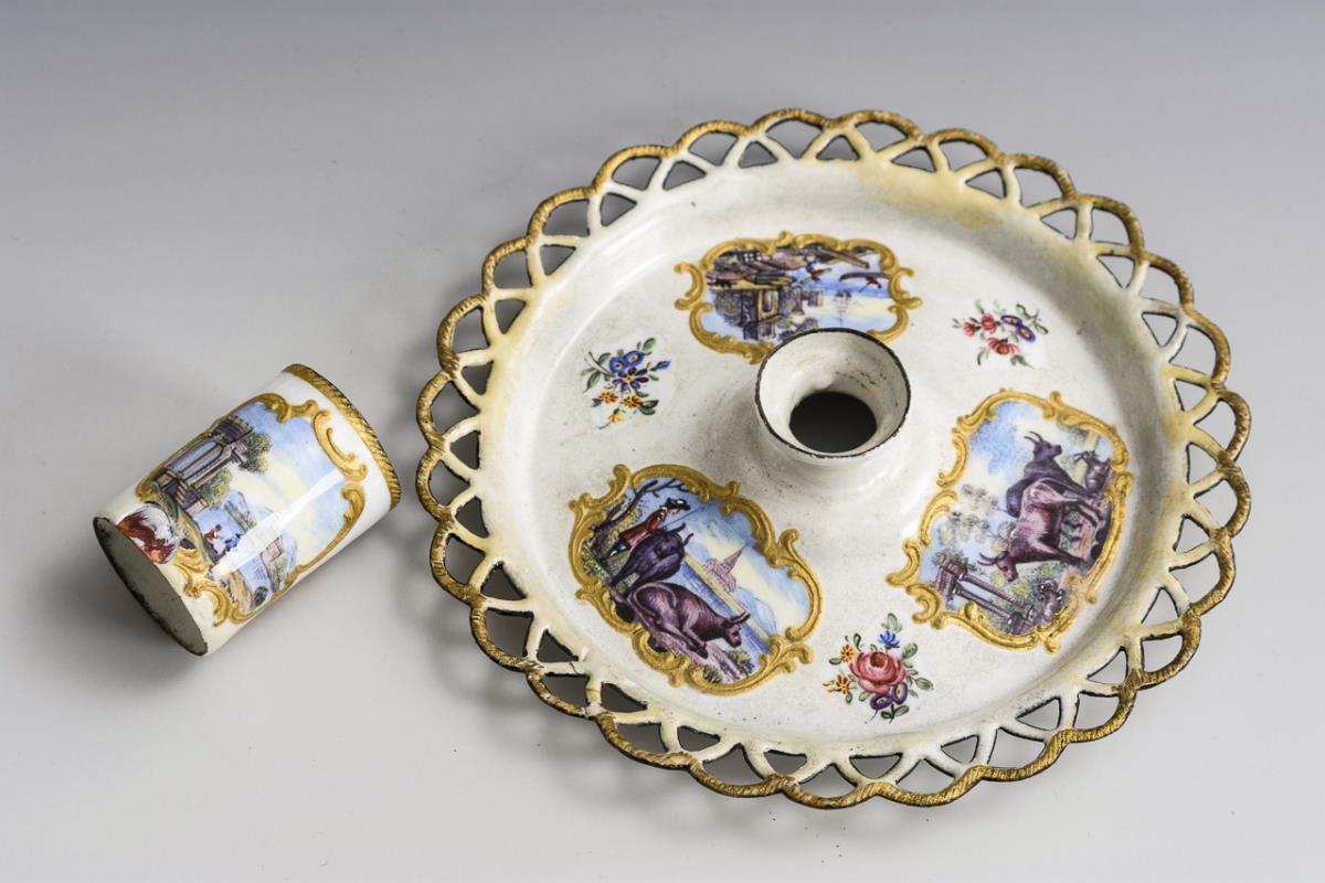Fußschale mit Bogenfries am Rand sowie lose aufgesteckter Stützring. Insgesamt 5 goldgerahmte Kartuschen mit staffierten Landschaften. Abplatzer am Email, teils alt restauriert.
