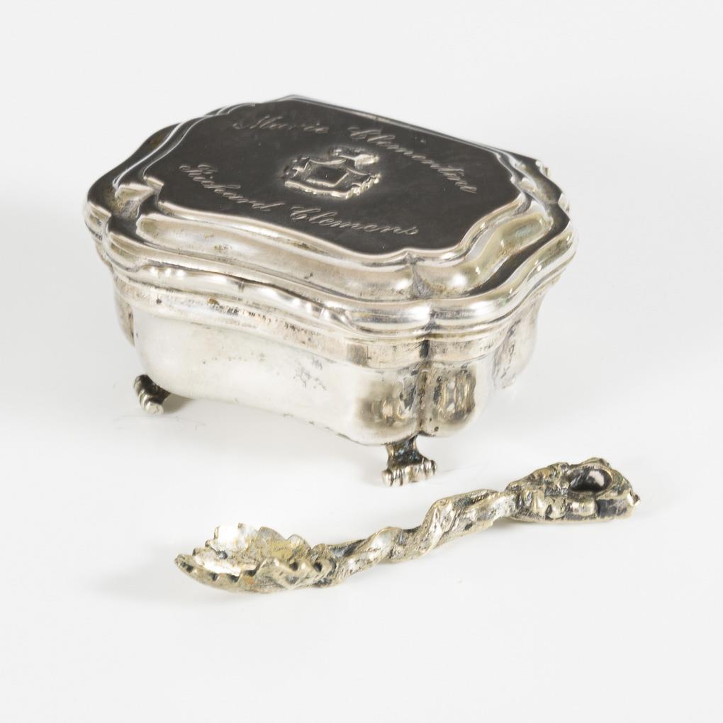 Kleines Deckeldöschen mit aufgelegtem Wappenschild und Gravur "Marie Clemetine Richard Clemens". Unterseitig: "F. H. G. HB". Innen vergoldet, mit Zwischensteg. Dazu kleiner Relieflöffel. Altersspuren.