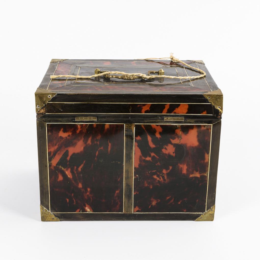 Allseits mit Schildpatt scheinkassettiert sowie Messing-Eckbeschläge und -Tragegriff. Die aufklappbare Fronttüren ergeben eine Schubfront. Die Eichenschübe zumeist mit teils beschrifteten Schiebedeckeln. Über den Schüben Fachungen für die Flaschen. Tragegriff ergänzt, einige Furnierergänzungen und geringe -fehlstellen, 4 Flaschen ergänzt, einige fehlen. 1 Schub lose anbei (Schubfach verschlossen), Alters-/Gebrauchsspuren.