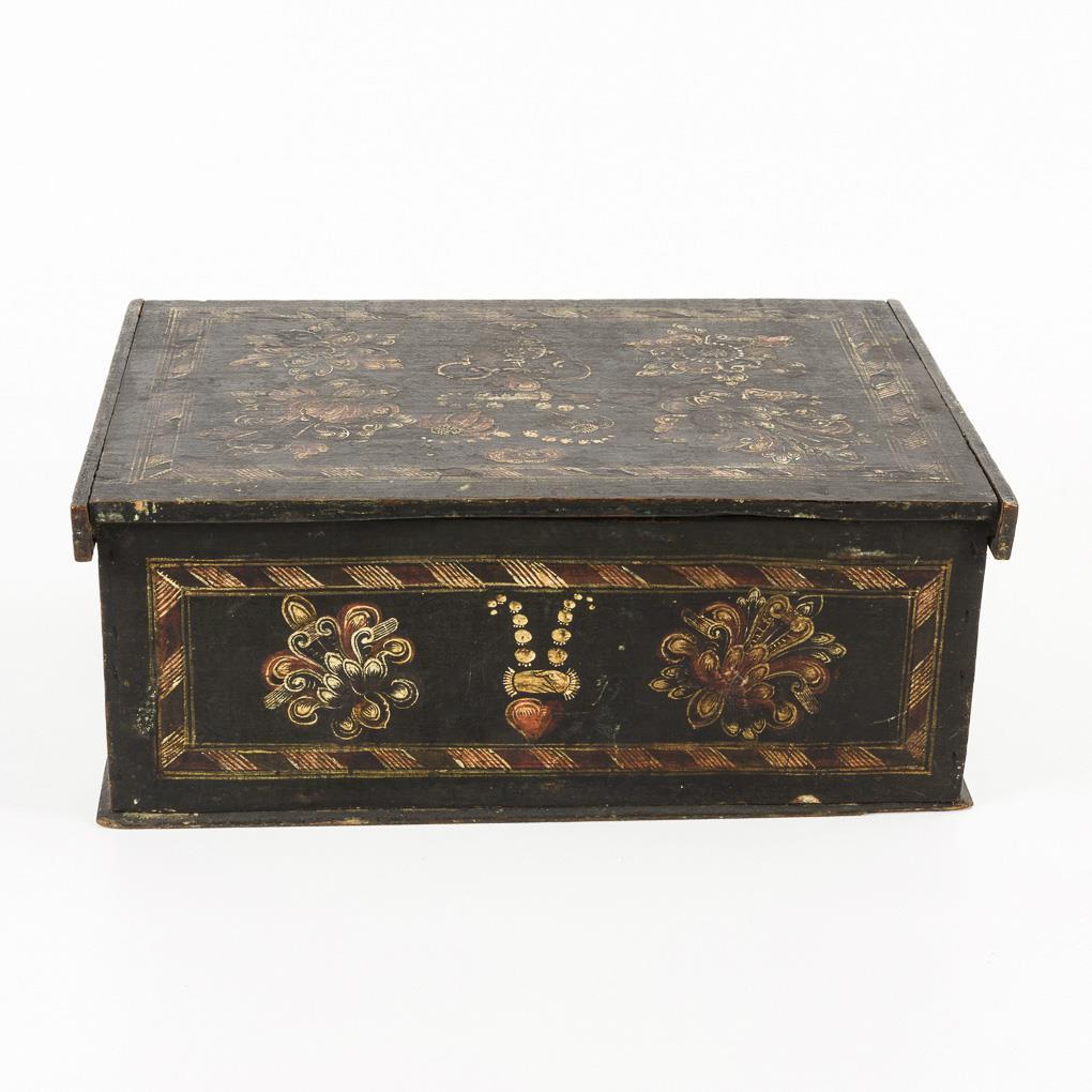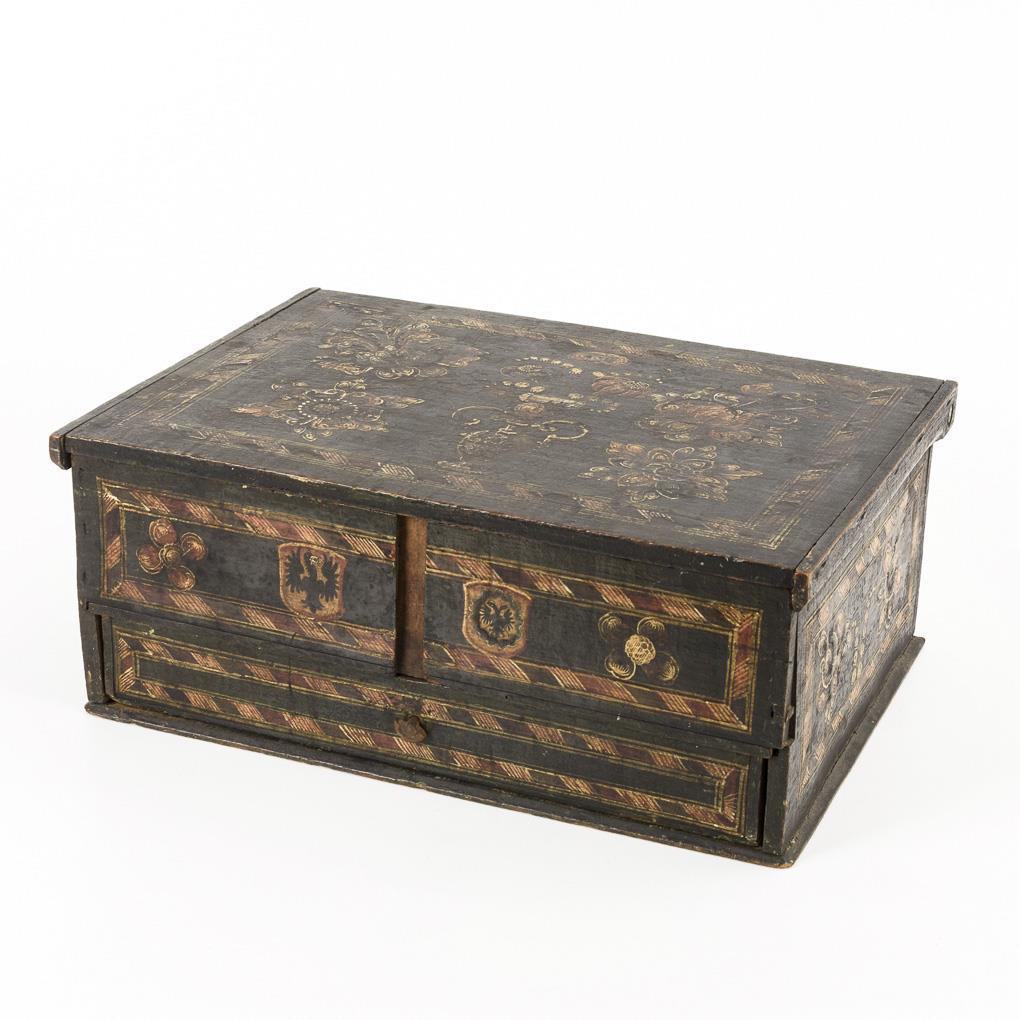 Quaderkorpus mit Schub in der unteren Frontzone sowie Deckel mit Holzscharnier. Allseits und auf dem Deckel scheinkassettiert und mit ornamentalen Blumen verziert. Zusätzlich auf dem Deckel zentrale Blumenvase, in der Front Wappen mit Adler bzw. Doppeladler; auf der Rückseite Handtreue über einem Herz (Minnekästchen). Mittelleiste der Front fehlt, Innenfachungen fehlen, Alters-/Gebrauchsspuren.