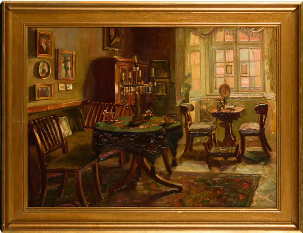 Biedermeier-Interieur mit Sitzmöbeln nahe dem Fenster bei einfallendem Tageslicht.