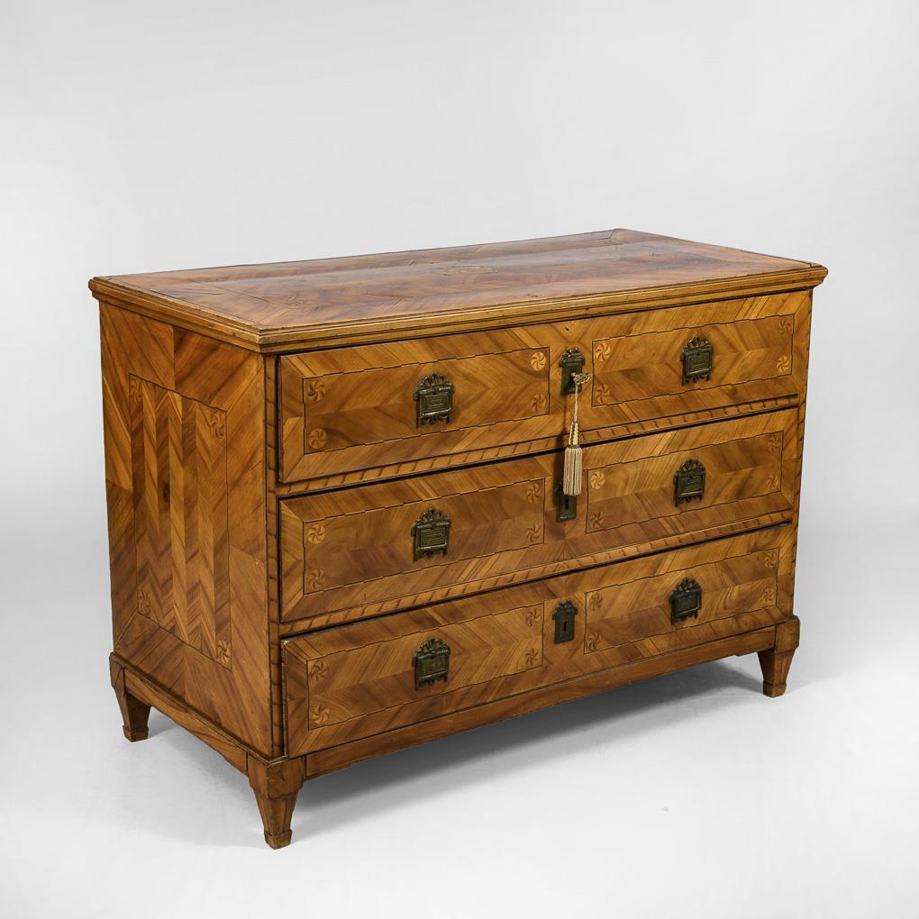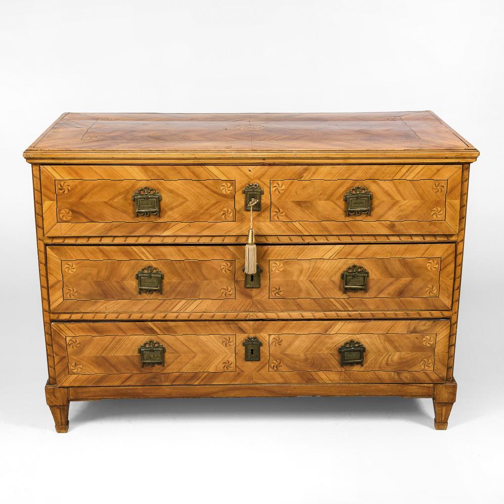 Große 3-schübige Kommode auf 4 sich verjüngenden Pfeilerbeinen, dekoriert mit Spiegelfurnier, Rosettenmarketerie und feinen Palisander-Fadenintarsien sowie antikisierenden Messing-Bügelgriffen und -Schlüsselbeschlägen. Restauriert, Alters-/Gebrauchsspuren, Trockenrisse im Furnier.