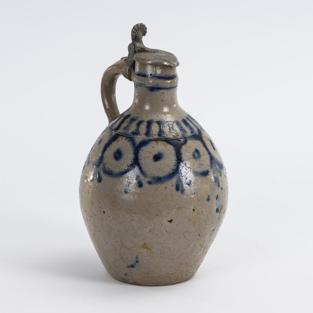 Kugelbauchkrug mit umlaufendem, blau bemaltem Stempeldekor, Bandhenkel, flacher Zinndeckel mit Muscheldrücker. Fein haarrissig, Deckel mit alten, teils reparierten Defekten.