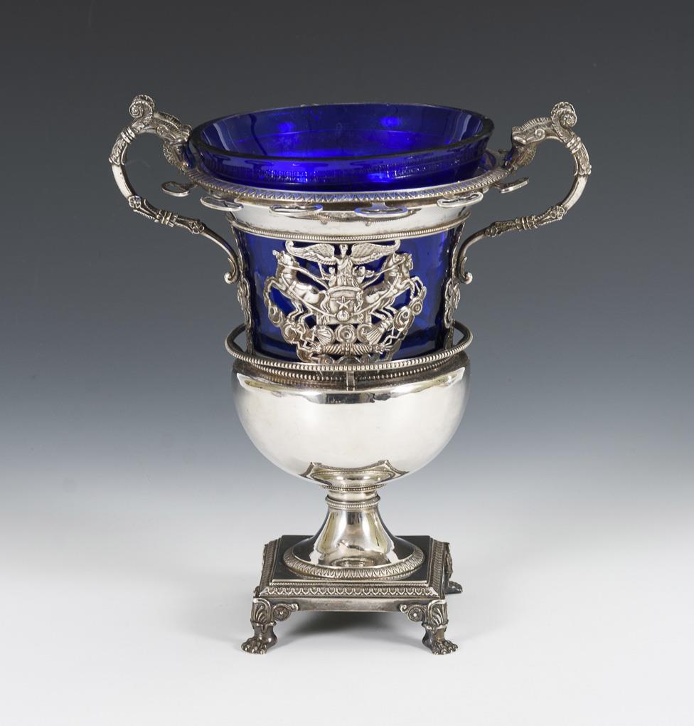 Elegant durchbrochenes Gefäß mit Siegesgöttin auf Quadriga und Tierkopfhenkeln. Seitlich Halterungen für 12 Löffel. Ergänzter Glaseinsatz mit Randchips, Fußansatz mit Lötspuren.